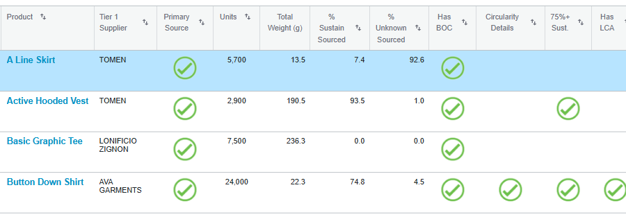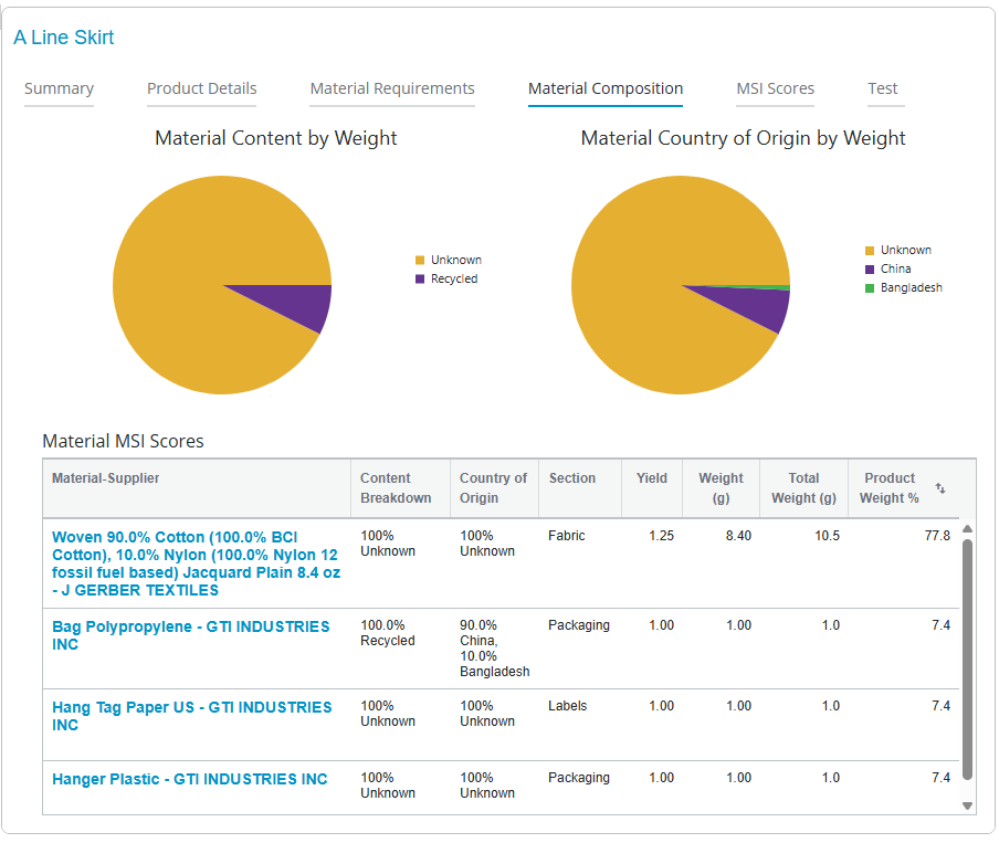 Not only does this allow the designer to verify that they have data for each of the materials (“we’re missing content data for our Hang Tag”), it also provides an estimate of whether the product meets any requirements you have for percent sustainably-sourced materials.