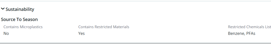 The presence of dangerous substances or microplastics is typically a set of attributes applied against a sourcing configuration (as shown below) and validated by the finished goods manufacturer through chemical tests. This usually includes documentation around the manufacturer complying with your Resistricte Substances List (RSL).