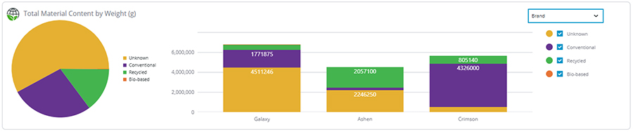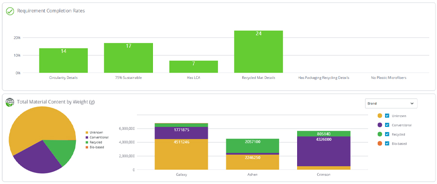 With a framework in place for handling required AGEC information, PLM can now be leveraged for both product- and season-level compliance tracking and analytics. At the season-level, you can see what percent of your products have completed each requirement or take a closer look at areas of your business missing information (e.g., which brands have a higher percent of “Unknown” material content).