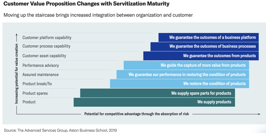 However, to reach this level of servitization can take time. HBR references Tim Baines, professor of operations strategy and executive director of the Advanced Services Group at Aston Business School, who, with his colleagues analyzed case studies on what successful firms did to get there. One deliverable of that research was an eight-step staircase model charting the evolution. This ‘servitization staircase’ Baines believes can form the basis of a plan to help companies reach their transformation goals.