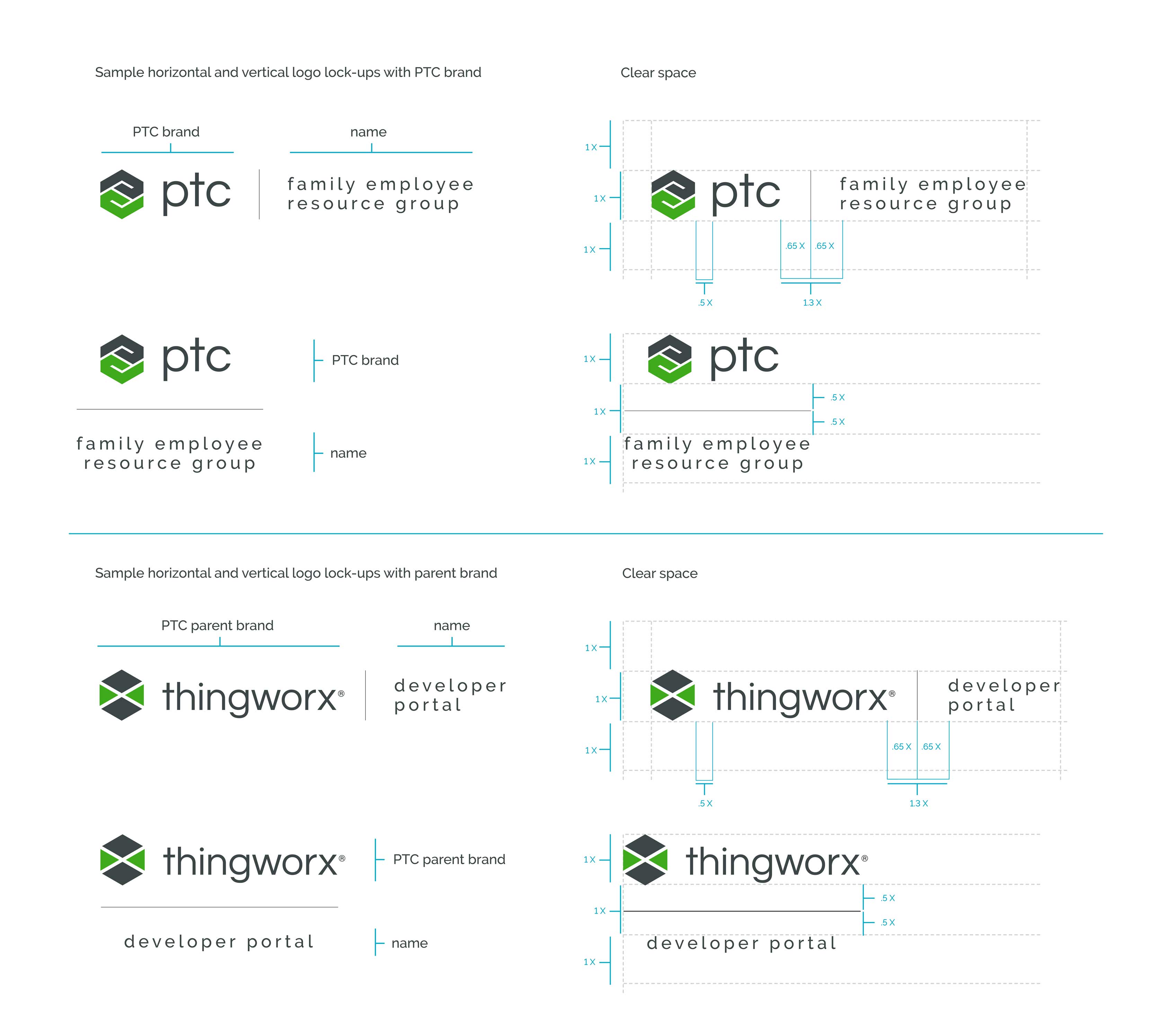 When PTC Logos are paired with names that are not corporate offerings, the name should appear in the PTC Raleway font to the right of the Parent Brand logo with a pipe. It can be written horizontally or stacked. When the name has two words and is stacked, the midline should align with the parent logo. When it is one word, the name should be centered to align with the parent logo.