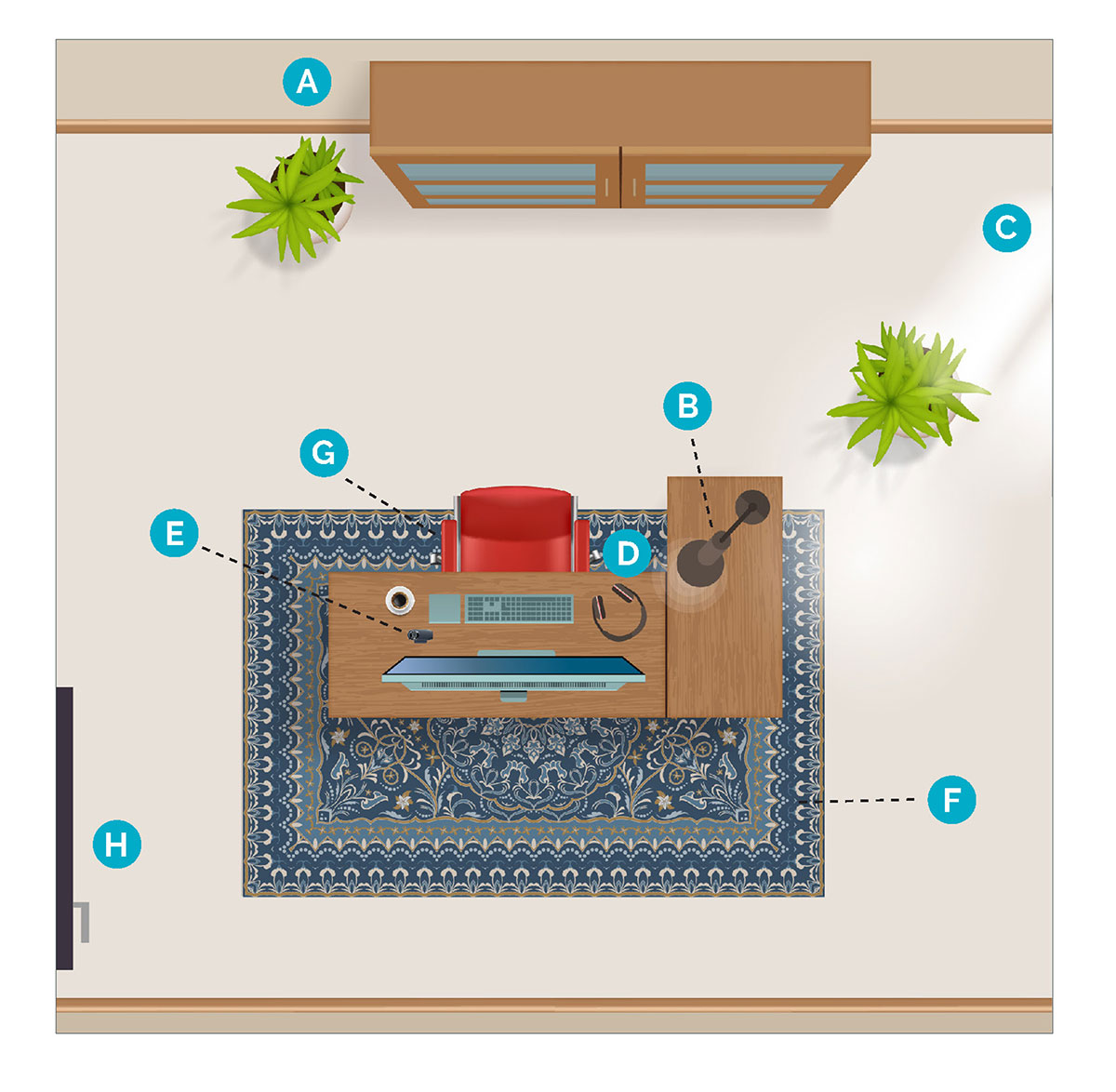 A - Choose a clean but interesting background. Avoid excess clutter or stark white walls. If you don’t have a clean background, choose a virtual backdrop.