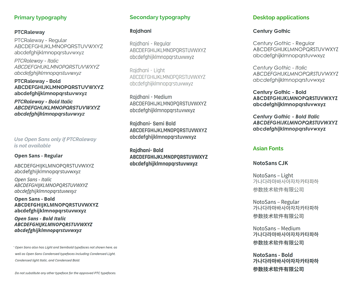 Our typography treatment ensures that PTC communications are consistent and expressive of our brand. PTCRaleway is PTC’s primary typeface and plays a major role in establishing PTC’s visual voice.