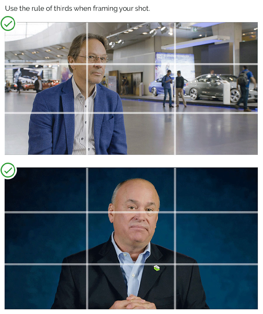 When shooting an interview, always follow basic photographic rule of thirds principles and basic 3-point lighting principles. Use a chip chart at the beginning of an interview for our editors in post-production—especially if shooting in a ‘raw’ or un-graded picture profile.
