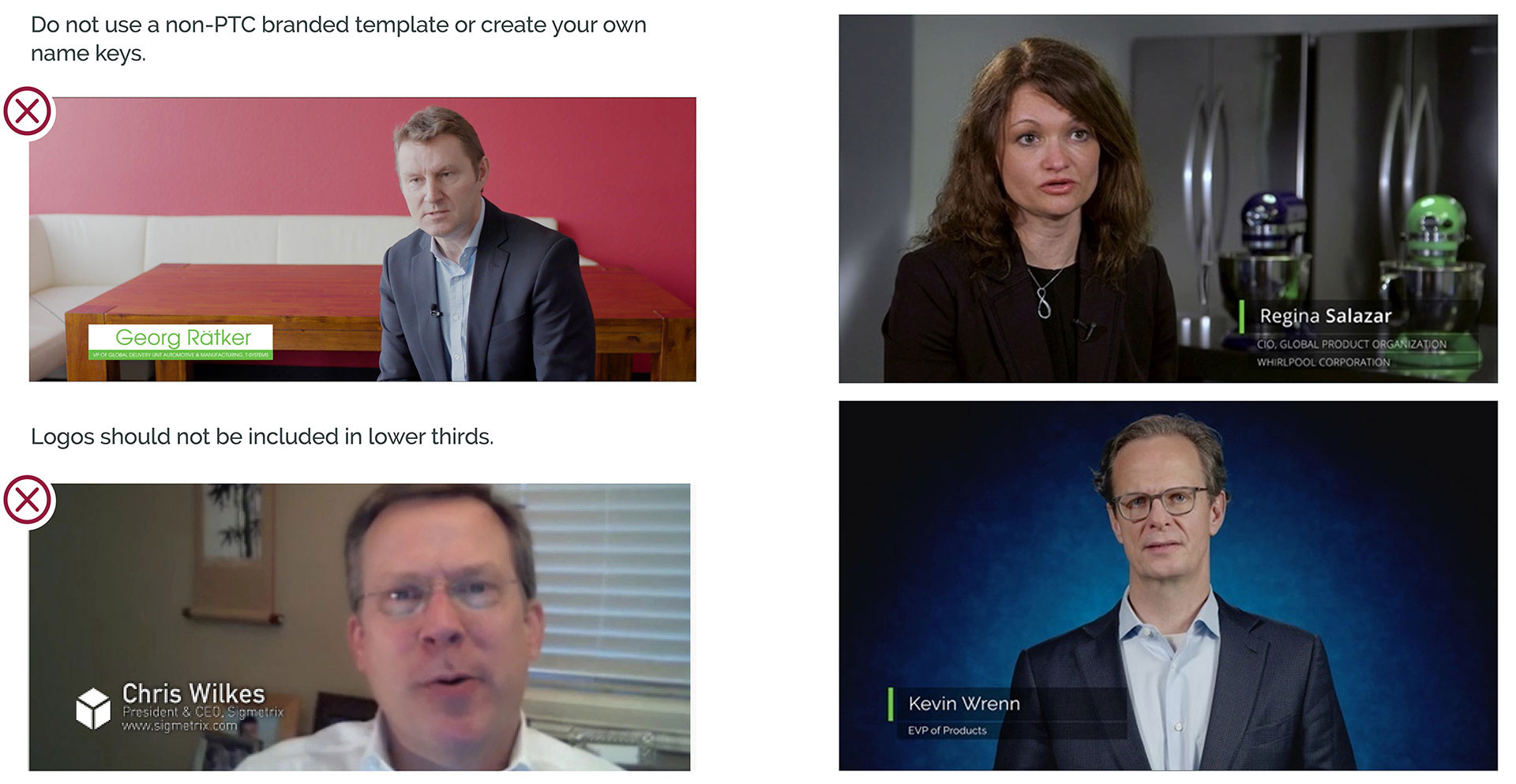 Identify individuals speaking on screen by name, title, and company using the branded FY22 Name Key Template. Placement of the graphic should be opposite from the onscreen talent. If talent is centered in the frame, place the name key on the left.