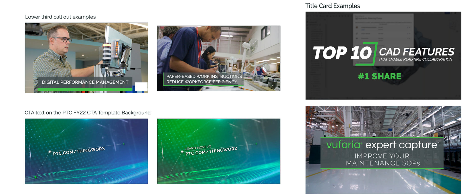 When using on-screen text for title cards, lower thirds, callouts or CTAs, follow the existing PTC brand guidelines for fonts, colors, icons etc. The style and placement of on-screen text should ultimately align with campaign creative.
