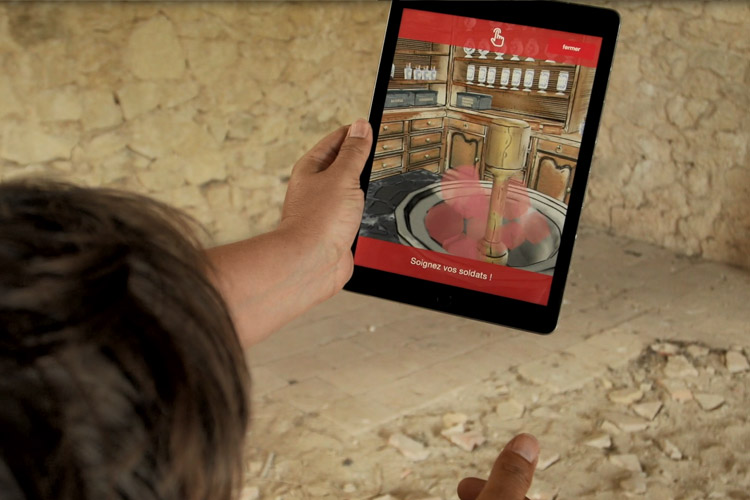 In addition to powerful visual overlays, the app includes explanations about specific features of Fort Médoc. Instead of visitors seeing unengaging signage or relying on a tour guide, they can use the app to learn more about the artifacts and rooms. If a user wants to engage with more details, they can click a button that says “more details” to find stories and multimedia content. For example, visitors can take an AR-enabled quiz that helps them understand what it was like to live in the barracks at Ford Médoc. Or, in the apothecary, visitors can opt into an escape game in which they must create a cure for infected, feverish soldiers. The app allows people to access different levels of information and engagement so that users can dig more deeply into the elements that interest them.