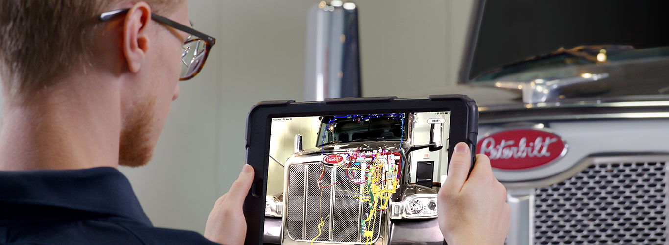 Using Vuforia, Peterbilt created more than 1,600 digital twins (and counting) for its trucks. Now, technicians can view complex wire harnesses inside of the equipment with “X-ray vision” functionality.