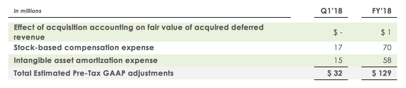 The first quarter and fiscal 2018 non-GAAP operating margin and non-GAAP EPS guidance exclude the estimated items outlined in the table below, as well as any tax effects and discrete tax items (which are not known nor reflected).