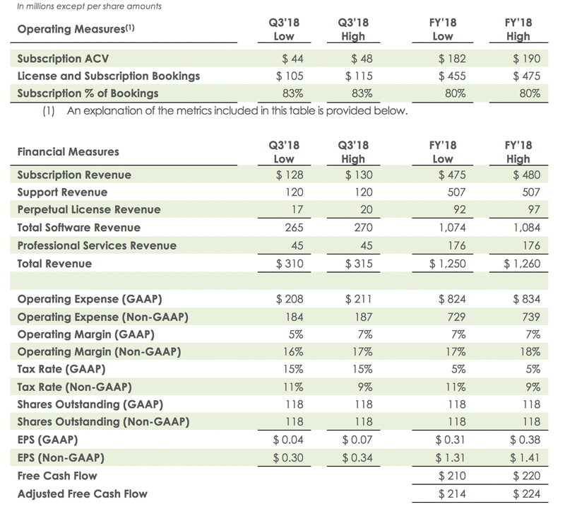 - Q2’18 GAAP software revenue was $262 million and non-GAAP software revenue was $263 million, an increase of 12% year over year in each case, despite a 700 basis point increase in the subscription mix compared to the same period last year.