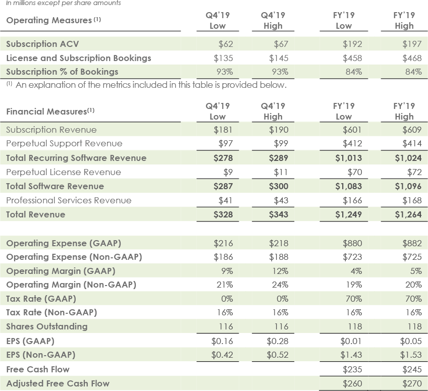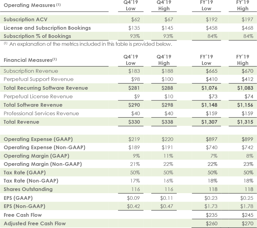 The Company's fourth quarter and fiscal year 2019 revenue and diluted earnings per share guidance is provided below. The revenue and diluted earnings per share guidance is provided on both a GAAP and a non-GAAP basis, and in accordance with both ASC 606 and ASC 605. Non-GAAP financial measures exclude the income statement effects of acquisition adjustments to deferred revenue, stock-based compensation, amortization of acquired intangible assets, acquisition-related transaction costs, restructuring charges and measurement-period adjustments related to the Tax Cuts and Jobs Act.
