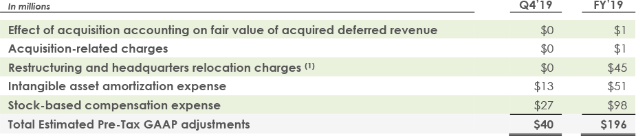 The fourth quarter and fiscal 2019 non-GAAP operating expense, non-GAAP operating margin and non-GAAP EPS guidance exclude the estimated items outlined in the table below, as well as any tax effects and discrete tax items (which are not known nor reflected). Adjusted free cash flow excludes $25 million of restructuring payments related to our workforce realignment and headquarters relocation.
