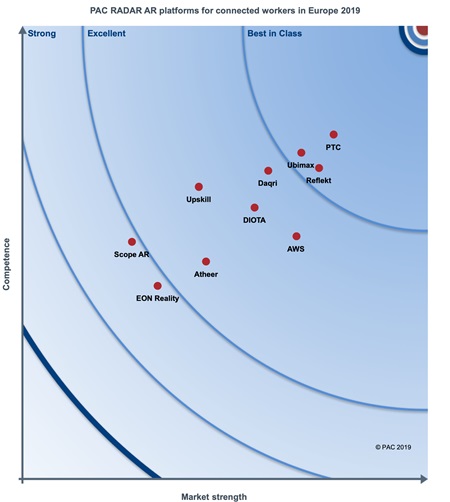 “We are pleased to have been awarded the top placement in teknowlogy’s PAC RADAR AR Platforms for Connected Workers in Europe 2019,” said Jim Heppelmann, president and CEO, PTC. “The affirmation from this esteemed analyst firm is consistent with customer feedback about the strength and excellence of our technology.”