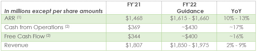 - ARR growth is expected to be approximately 15% in Q1’22, stronger than in the remainder of fiscal ‘22, since Q1’21 did not include ARR for Arena, which was acquired in Q2‘21. From Q2 through Q4 of fiscal ’22, we expect approximately linear performance, with consistent year-over-year growth rates.