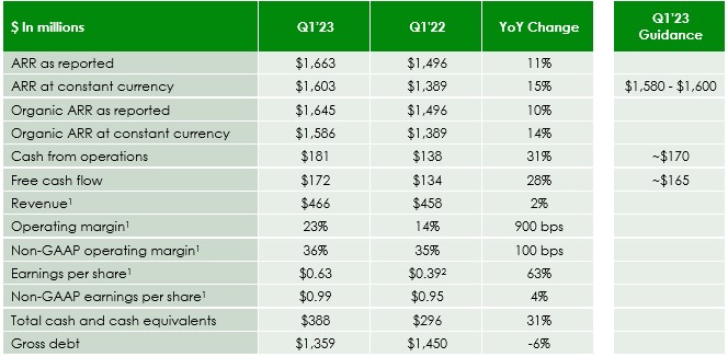 - We provide ARR guidance on a constant currency basis, using our FY’23 Plan foreign exchange rates (rates as of September 30, 2022) for all periods. Foreign exchange fluctuations during Q1’23 had a favorable impact on our Q1’23 reported ARR, compared to our Q1’23 constant currency ARR. Using foreign exchange rates as of the end of Q1’23 and assuming the midpoint of our constant currency guidance ranges: