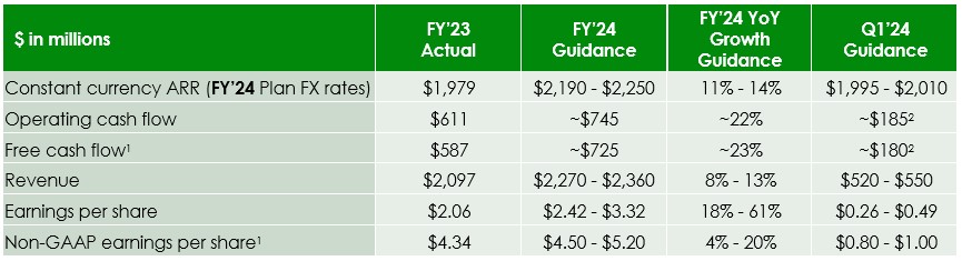 - We provide ARR guidance on a constant currency basis, using our FY’24 Plan foreign exchange rates (rates as of September 30, 2023) for all periods.