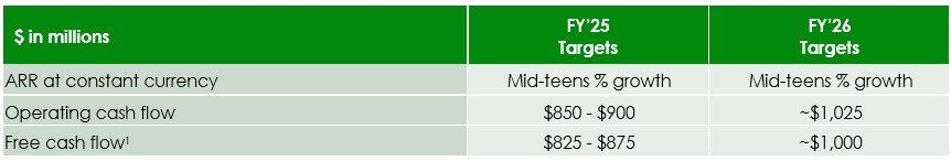 Neil Barua, CEO-elect, added, “We continue to target mid-teens growth over the medium term. While the macroeconomic environment could impact any given period, we believe our differentiated product portfolio and market position put us in a good position to drive sustainable top line growth. Given the stability of our subscription license model, we expect non-GAAP operating expense growth at roughly 50% of ARR growth over the medium term, as we continue to invest in our product portfolio. In terms of free cash flow, we are providing targets through FY’26 that represent a three-year CAGR of approximately 20%.”