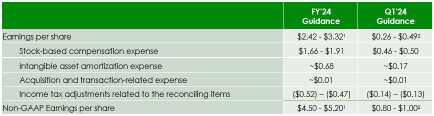 (2) Our Q1’24 EPS and non-GAAP EPS guidance are both inclusive of an expected $36 million in interest expense ($29 million, net of tax) or $0.30 per share ($0.24 per share, net of tax). This compares to interest expense in Q1’23 of $16 million ($14 million, net of tax) or $0.14 per share ($0.12 per share, net of tax) with the expected increase in Q1’24 primarily due to an increase in debt.