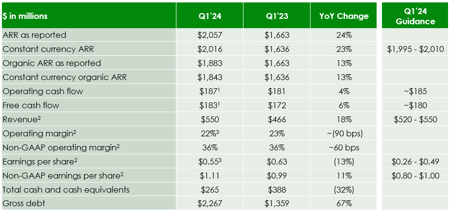 “Our ARR and free cash flow results in Q1’24 were solid, driven by the resilience of our subscription license business model, consistent execution, operational discipline, and the actions we have taken over time to align our investments with market opportunities. We continue to rapidly de-lever, with our debt to EBITDA ratio back under 3.0x at the end of Q1. Despite the ongoing challenging macro backdrop, our full year guidance for ARR and FCF remains unchanged, and we believe we have set our Q2 guidance prudently,” said Kristian Talvitie, CFO.