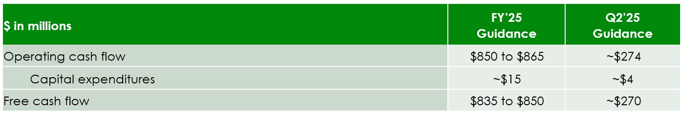 (2) FY’25 cash flow guidance includes approximately $20 million of outflows related to go-to-market realignment, of which $11 million was paid out in Q1’25 and approximately $4 million is expected in Q2’25.