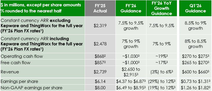 - Introducing FY’26 guidance for constant currency ARR growth of 7% to 9%, operating cash flow of approximately $1.03 billion, and free cash flow of approximately $1 billion (including Kepware and ThingWorx for the full year); to be updated when the divestiture is closed