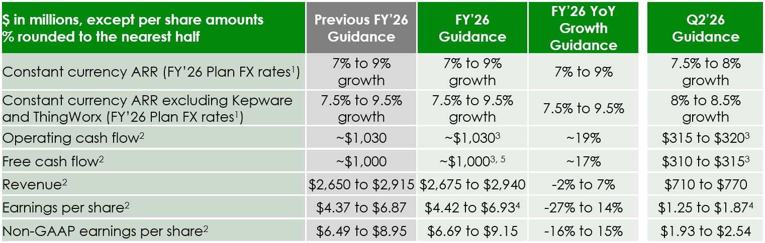 - The guidance assumptions below reflect our business as currently constituted and do not take into account the effect of the Kepware and ThingWorx divestiture, except for costs already incurred in Q1’26 and expected in Q2’26. We still expect approximately $160 million of divestiture-related expense payments and cash taxes in FY’26 in connection with the closing of the transaction, which are not expected to recur in future years. We will update our FY’26 guidance in conjunction with the closing of the transaction.