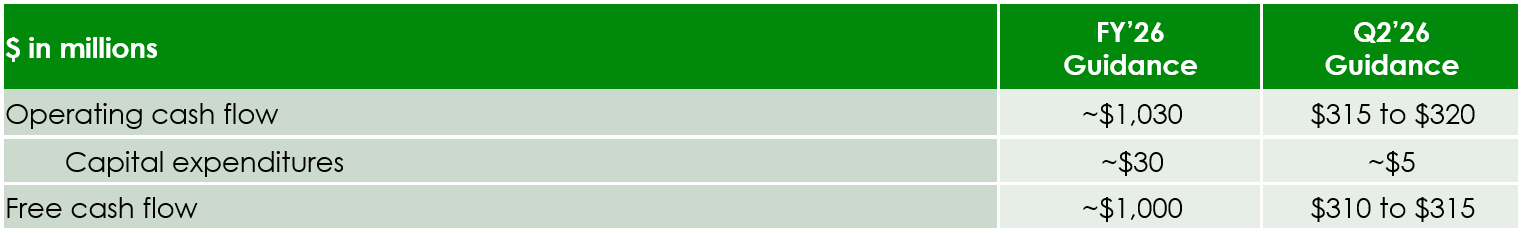 - Capital expenditures are expected to be approximately $30 million, with approximately $20 million of capital expenditures in FY’26 that are not expected to recur in future years, related to moving a major R&D center to a new office.