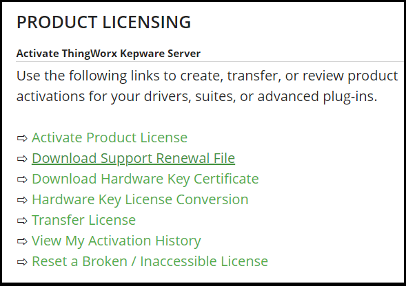 - Login to the My Kepware portal and select Download Support Renewal File link.