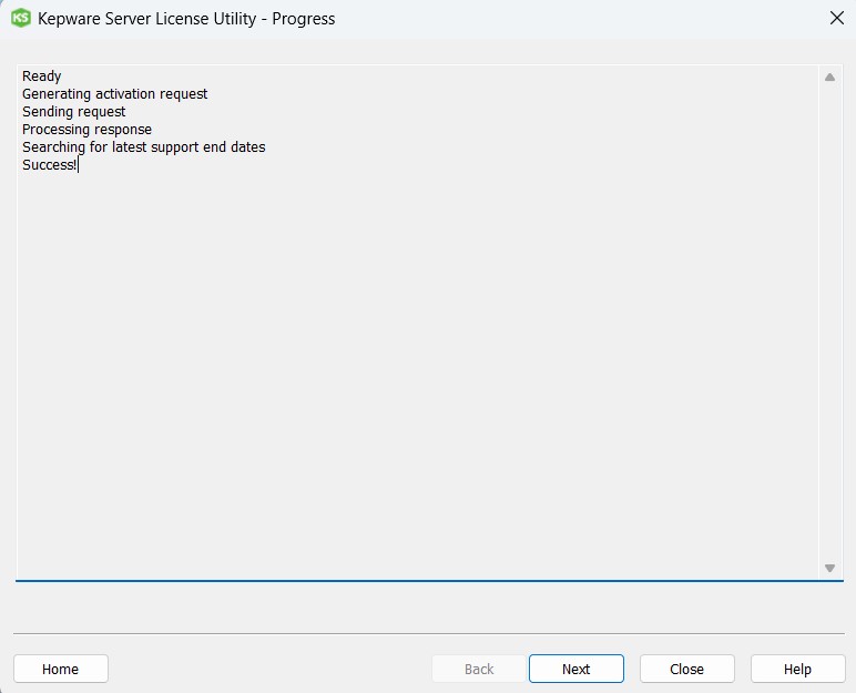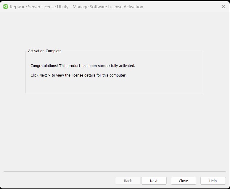 Note: At this point, the response file will be processed. - Upon successful activation in Kepware Server, an Activation Complete screen will be displayed.