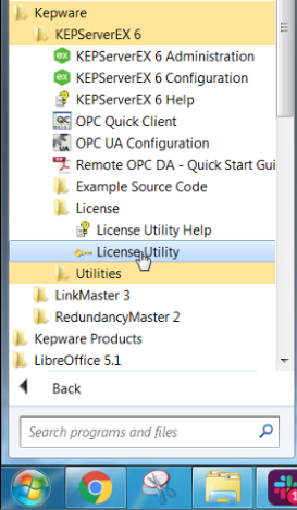 - All Programs / Kepware / KEPServerEX 6 / License / License Utility