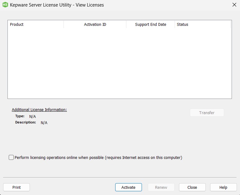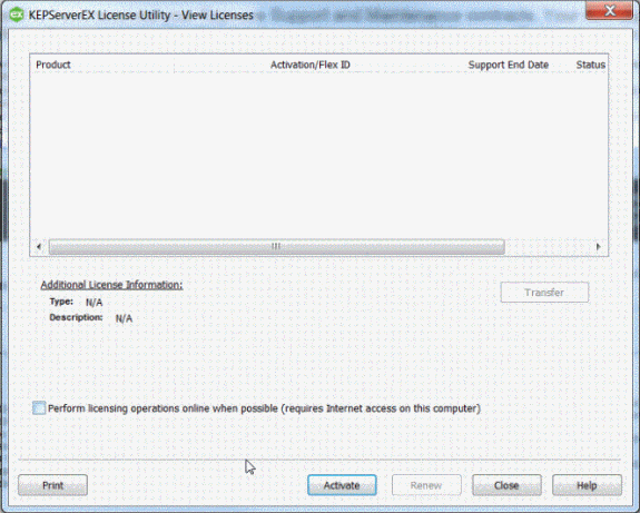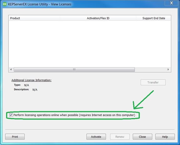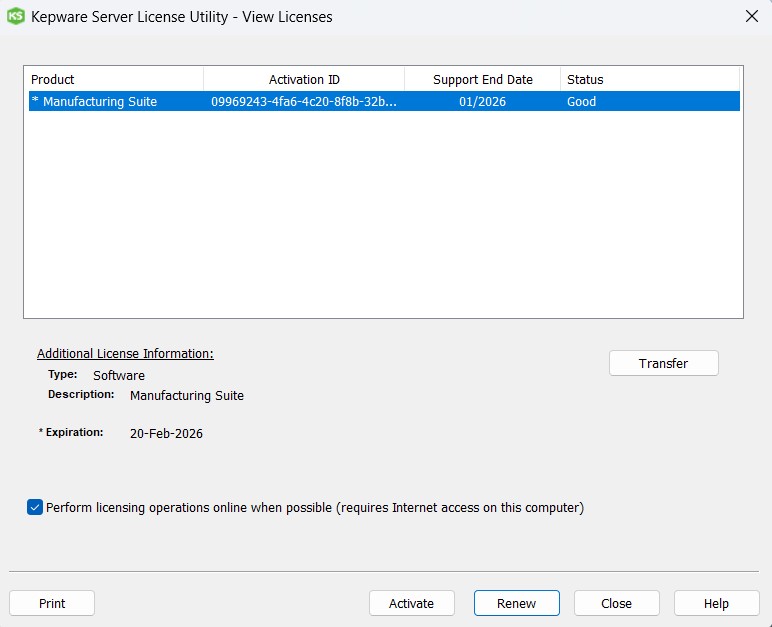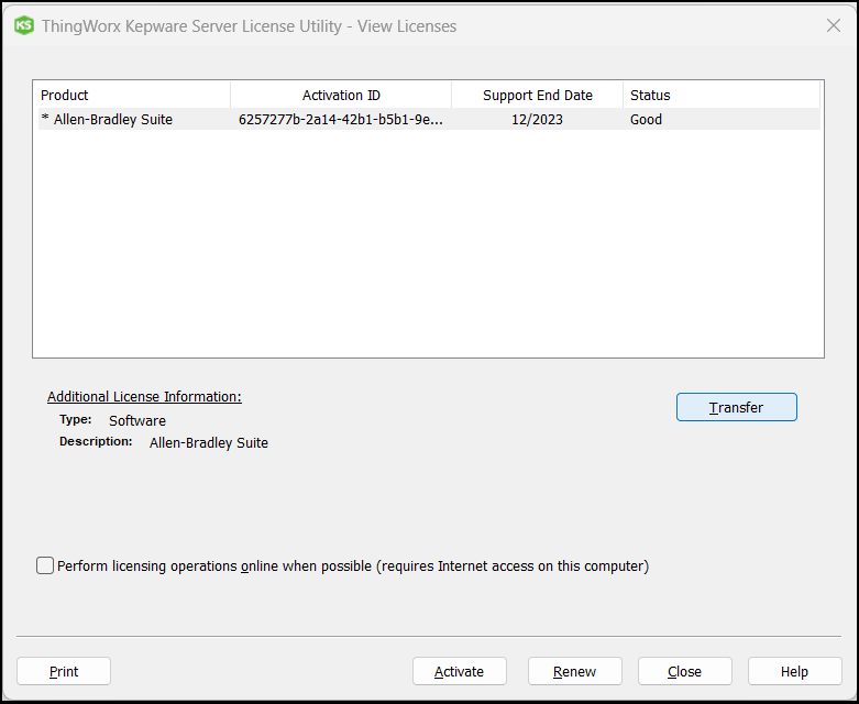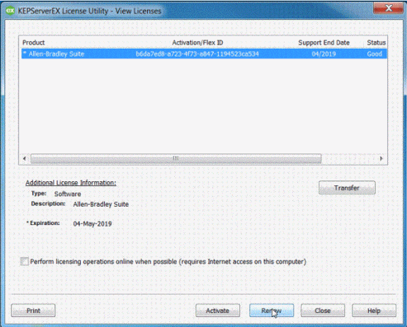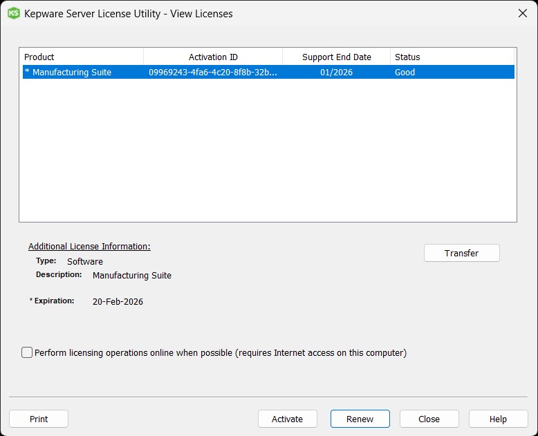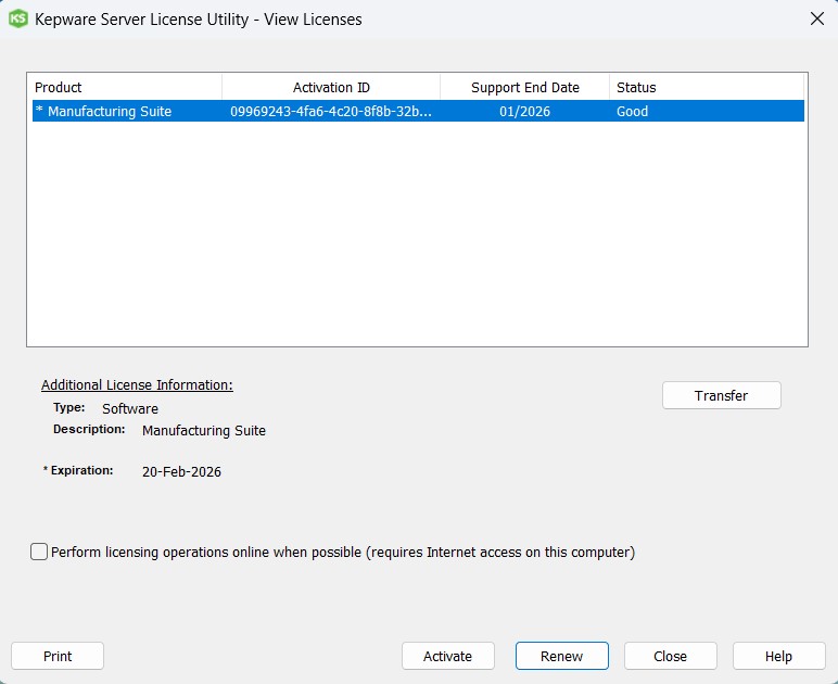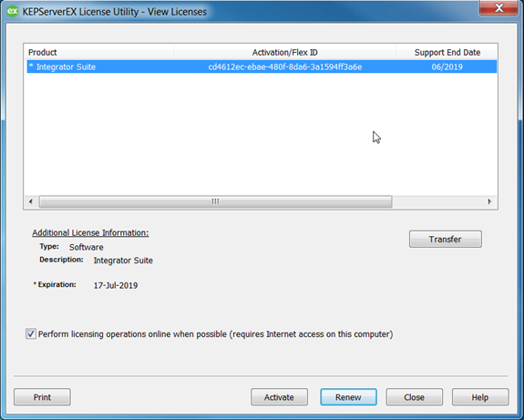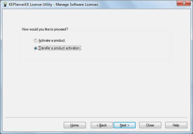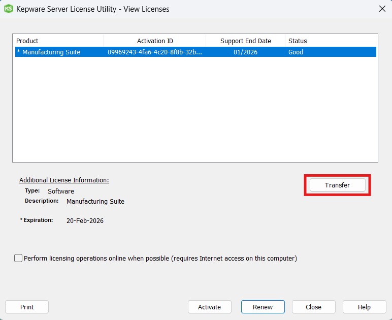 Transfer one or more Kepware Server Version 6 licenses in a single transaction online or offline.