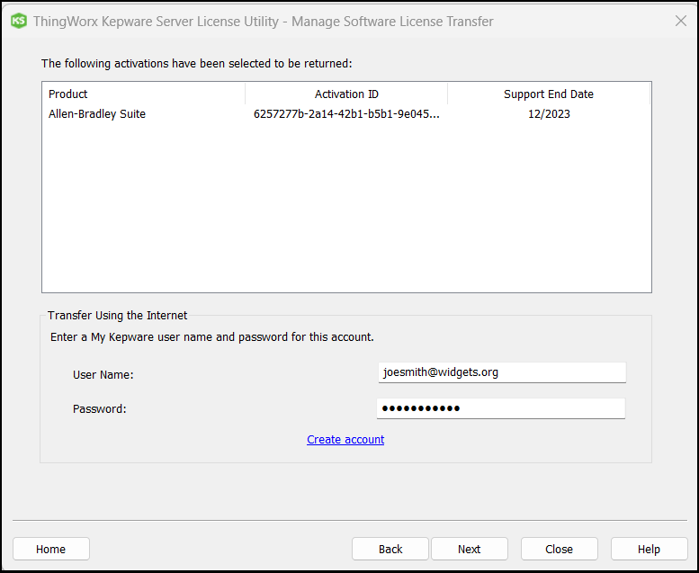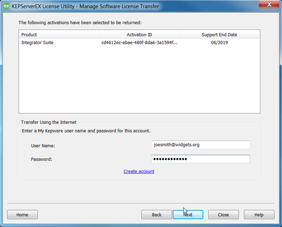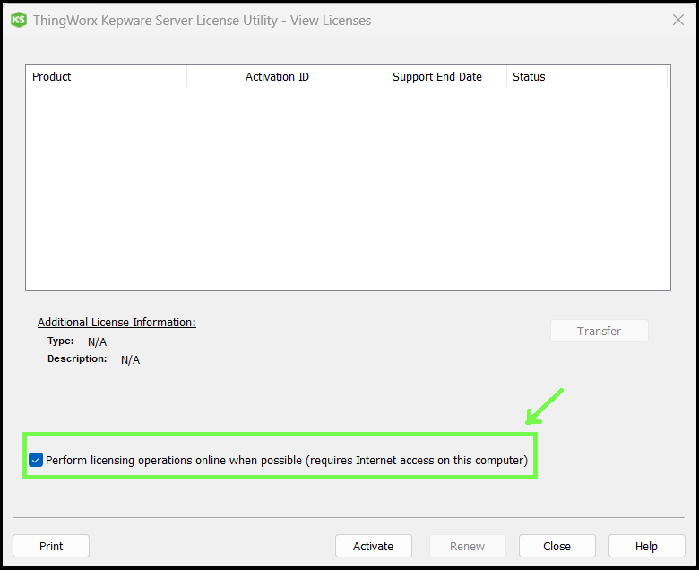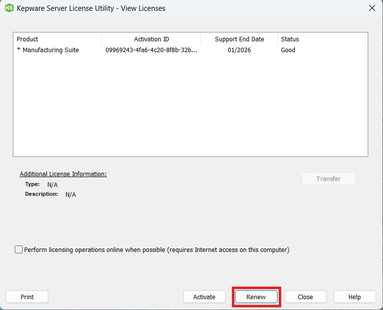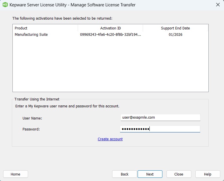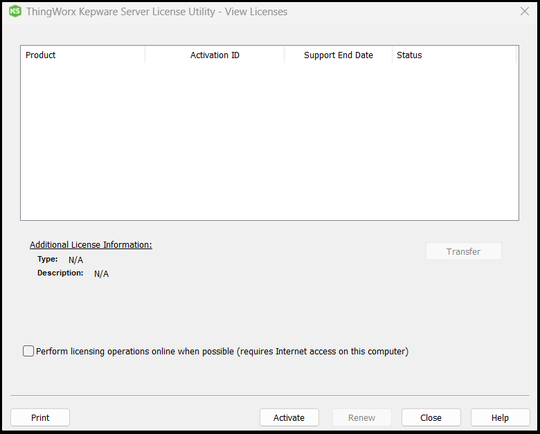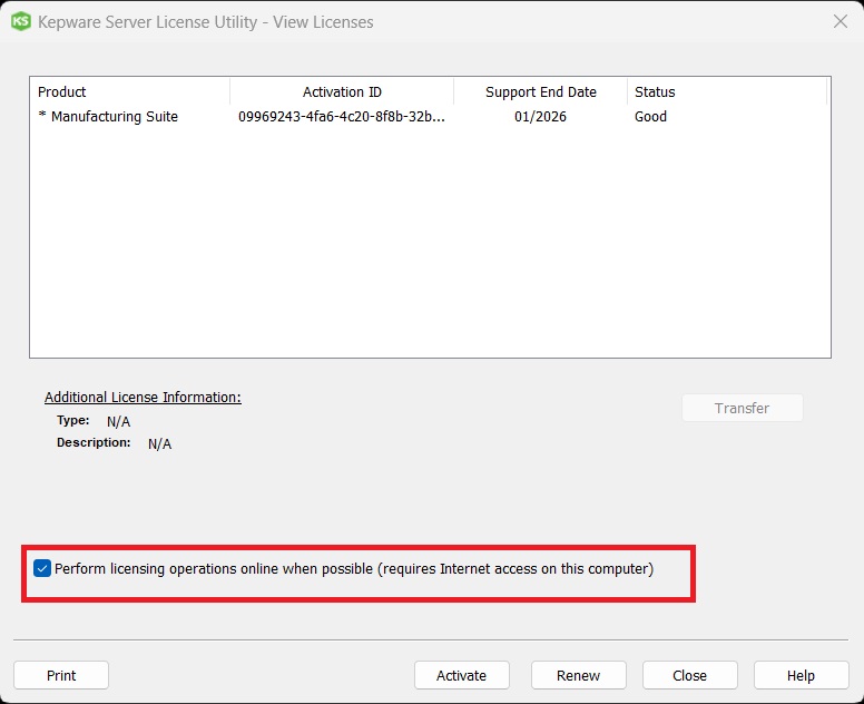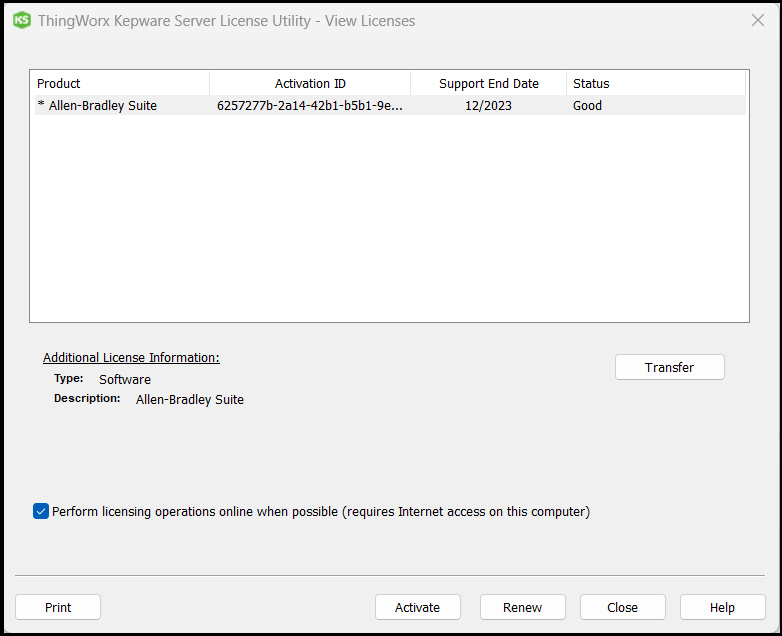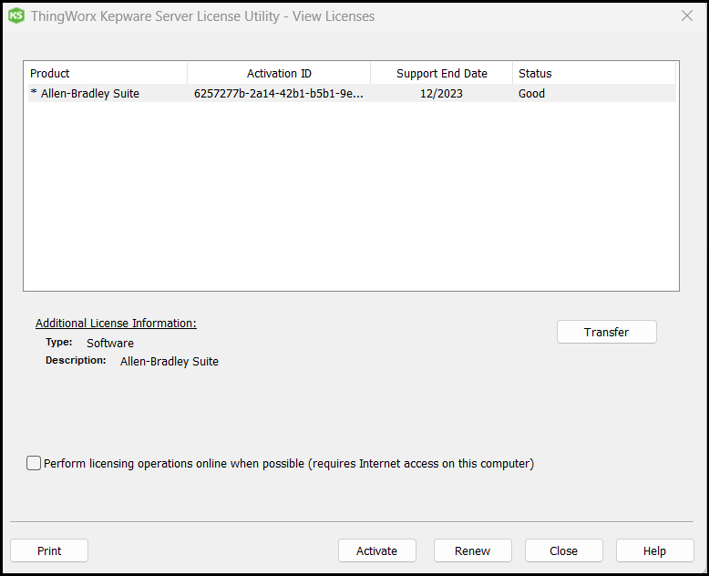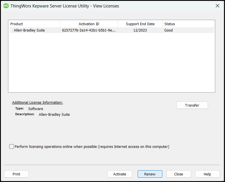 Transfer one or more Kepware Server Version 6 licenses in a single transaction online or offline.