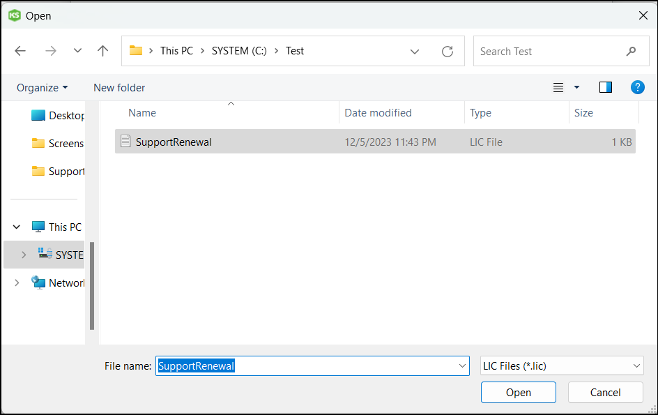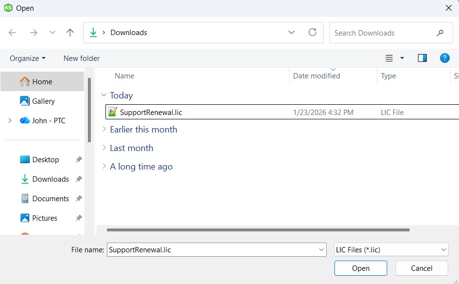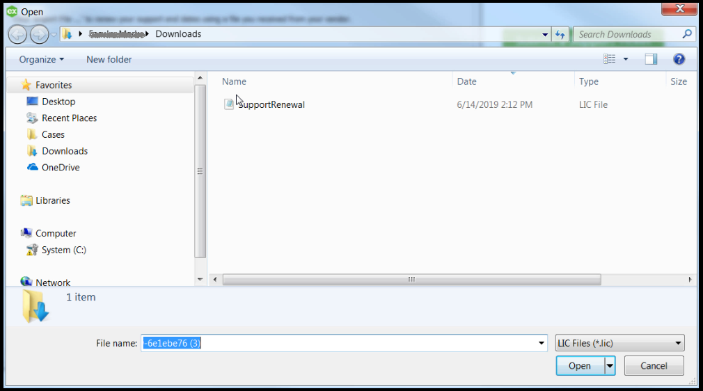 - Select the .lic file saved to portable media in step 2 and click Open.