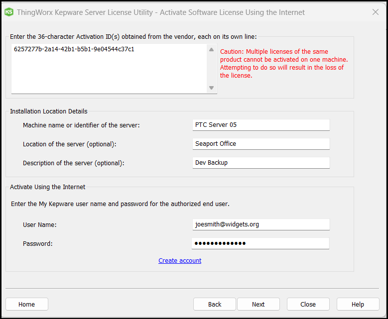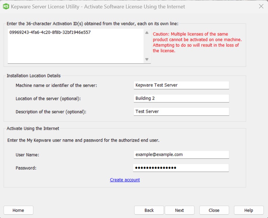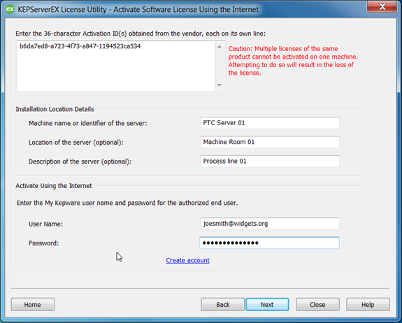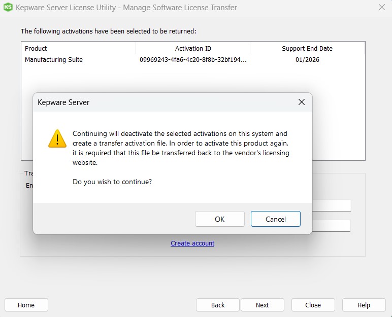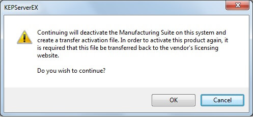 - A warning will be displayed that describes how the license must be transferred back to my.kepware.com before it can be activated for use on a new machine. Click OK to continue.