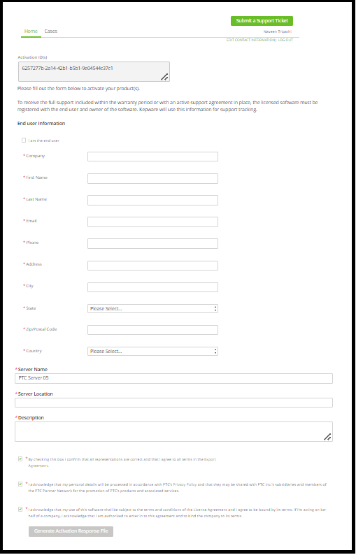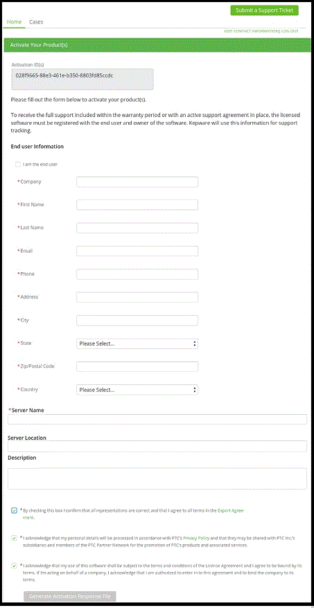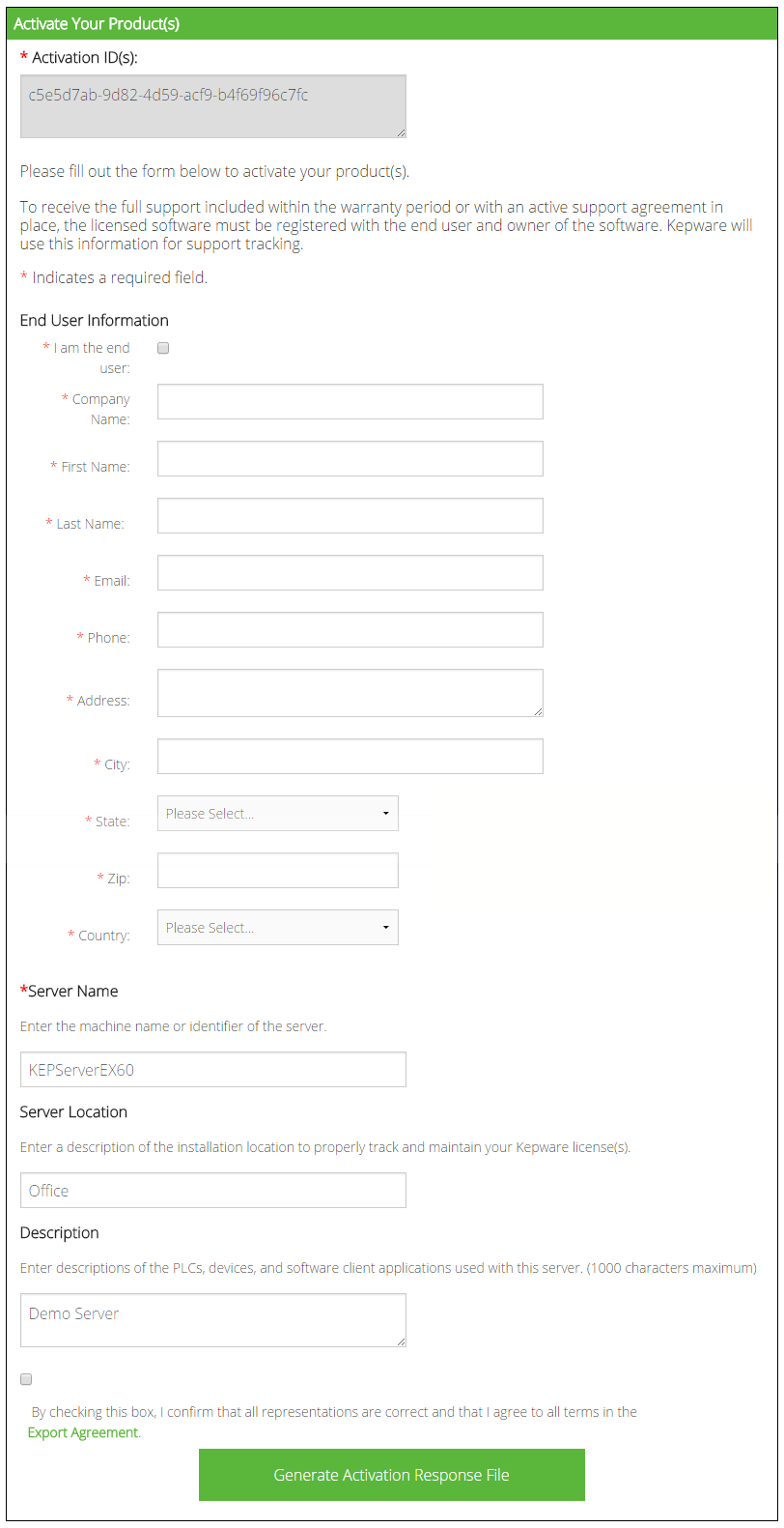 - Complete all required fields on the form, and then click Generate Activation Response File. Save the activation response file (“response.txt”) to portable media.