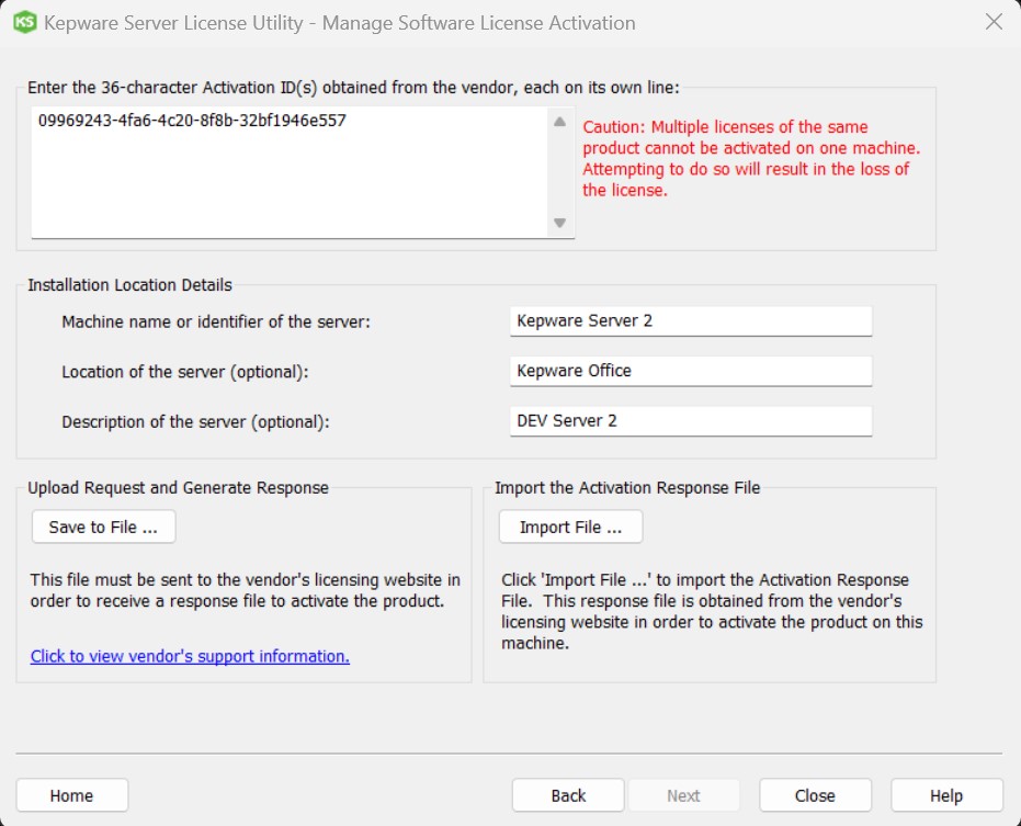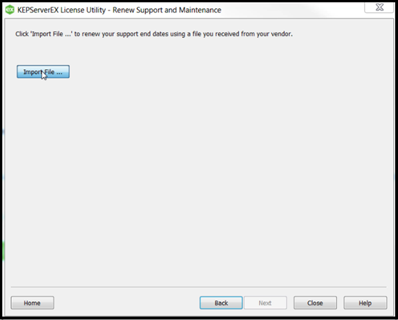 Note: If you are using an already upgraded V5/V6 compatible License Activation ID in version 5, you CANNOT import the Support Renewal File because that functionality does not exist in Kepware Server V5.