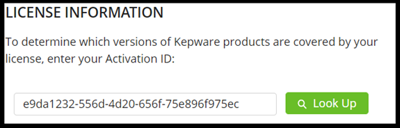- Copy and paste the activation ID in question into the "License Information" text field and select Look Up as shown below: