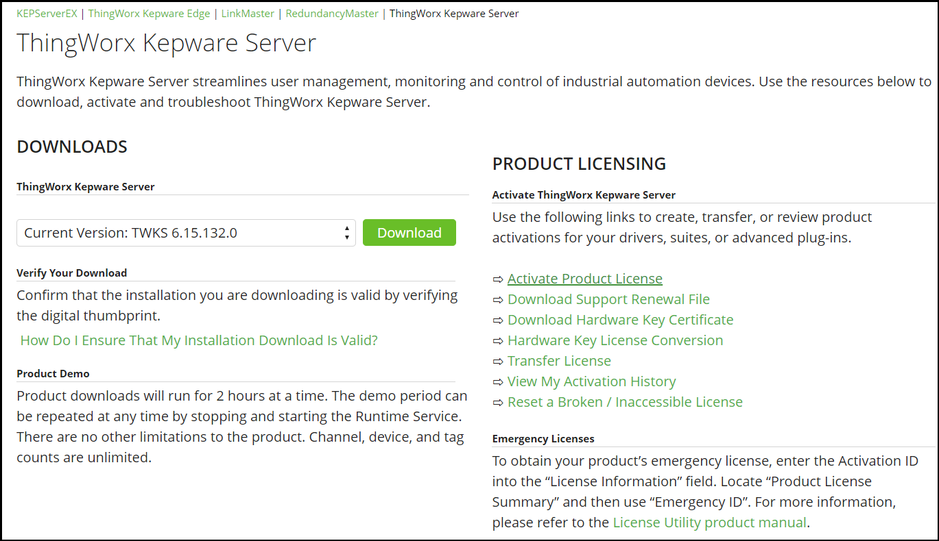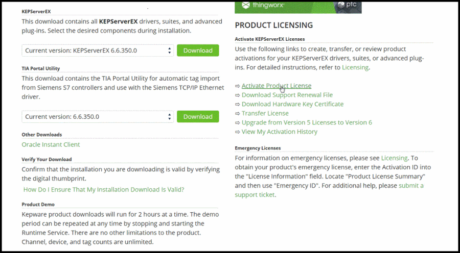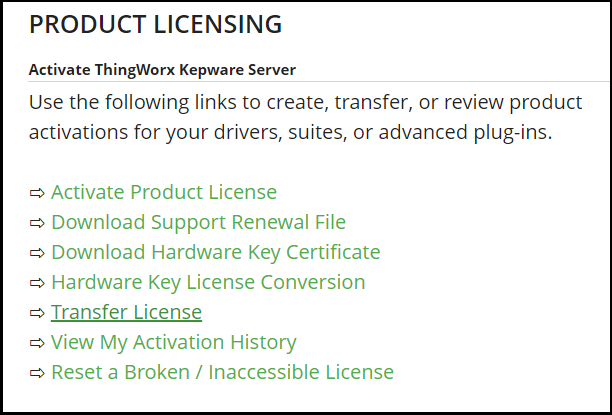 Transfer one or more ThingWorx Kepware Server Version 6 licenses in a single transaction online or offline.