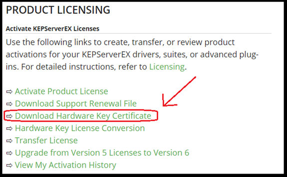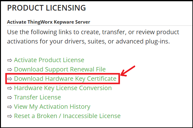 If you need a new copy of the Hardware Key Certificate file, please logon to the My Kepware portal and select the Download Hardware Key Certificate link as shown below: