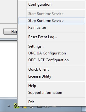 - Kepware Server: Right-click on the Kepware Server icon located in the System Tray and then select Stop Runtime Service. Once stopped, restart it by right-clicking on the Kepware Server icon located in the System Tray and selecting Start Runtime Service.