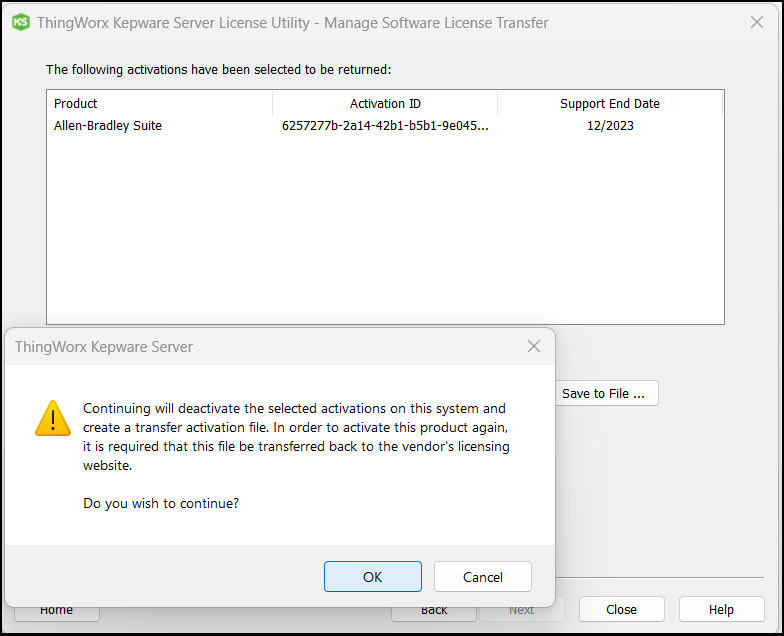 - Click Save to File… to deactivate the license on the machine. A warning will be displayed that describes how the license must be transferred back to my.kepware.com before it can be activated for use on a new machine. Click OK to continue.