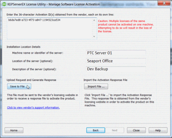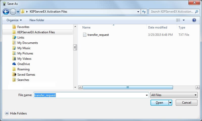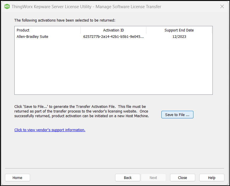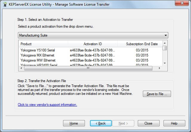 - Under Transfer the Activation File, click Save to File... in order to deactivate the license on the machine. Doing so means that the license rights will no longer be respected by the installed software. If the resulting transfer request file is not processed in the My Kepware portal, users will be unable to use the license