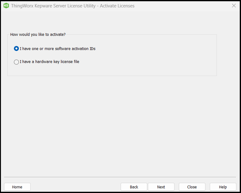 - Upon successful activation in Kepware Server, an Activation Complete screen will be displayed. Click Close to exit or Next to access the View Licenses page.