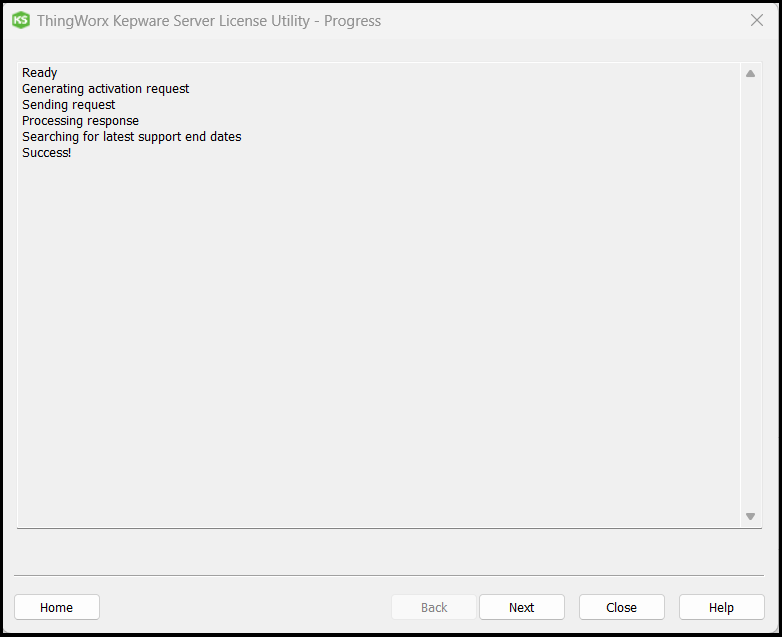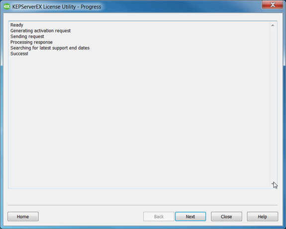 Note: At this point, the response file will be processed. - Upon successful activation in Kepware Server, an Activation Complete screen will be displayed