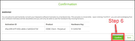 - A pop-up window will itemize any license(s) being moved to the designated hardware key and seek your confirmation that this process cannot be reversed. Click Confirm to proceed.