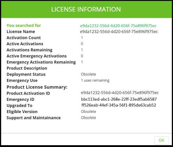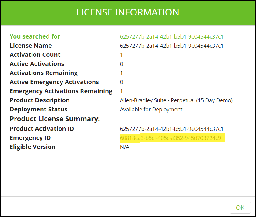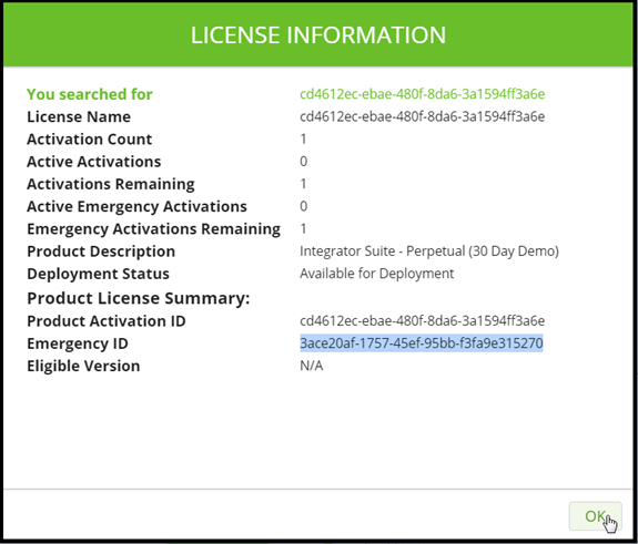 An Emergency Activation ID is provided with each purchased Perpetual / Subscription Activation ID to be used in the event of a machine or system failure occurring outside of standard business hours. The emergency license is designed to be deployed over the top of a broken or missing license, and restore functionality for a limited amount of time (seven days).