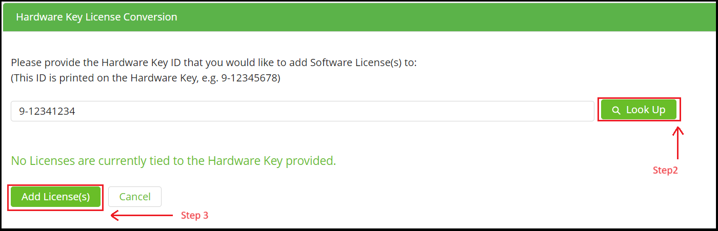 - To add soft license(s) to the hardware key, select Add License(s) in the bottom left of the screen.