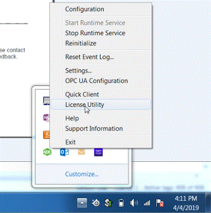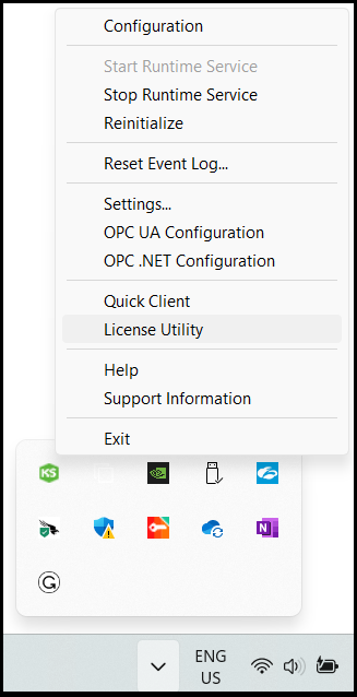 - Kepware Server: Right-click on the Kepware Server icon located in the System Tray and then select License Utility.