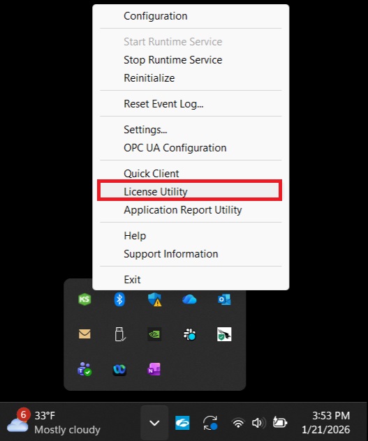 - Right-click on the ThingWorx Kepware icon located in the System Tray and then select License Utility.