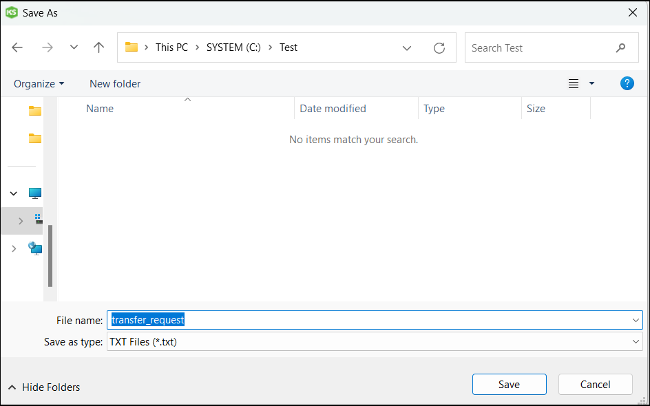 - In the file-browse dialog, save the request file (“transfer_request.txt”) to portable media.